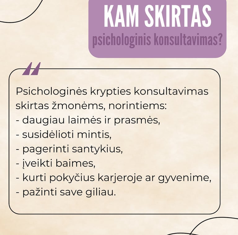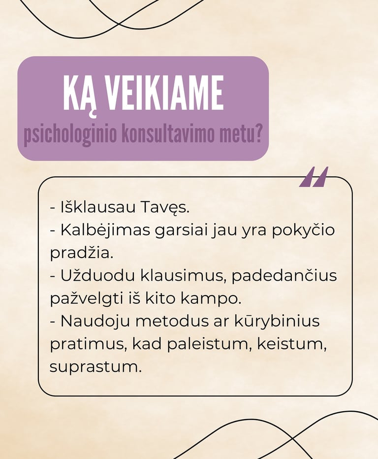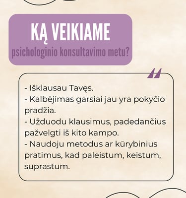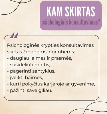 Konsultacijose taikau humanistinį, į žmogų orientuotą požiūrį, kuris remiasi pagarba, empatija ir autentišku ryšiu. Mano praktikoje svarbu ne tik spręsti konkrečius sunkumus, bet ir padėti žmogui pažinti save giliau – savo emocijas, poreikius, ribas ir vertybes.